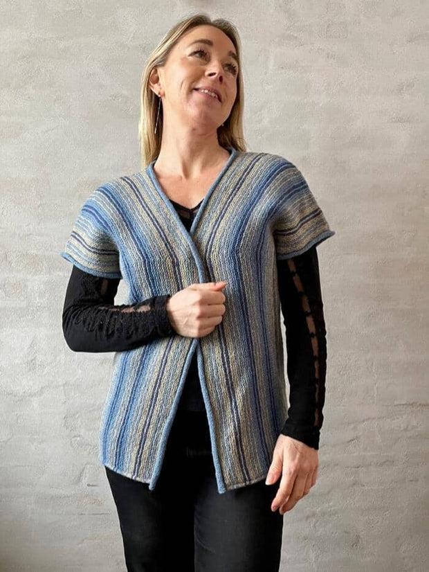 Pretty vest with stripes in garter stitches. Great for keeping you warm both summer and winter. Wear it as is, or style it with a belt.
